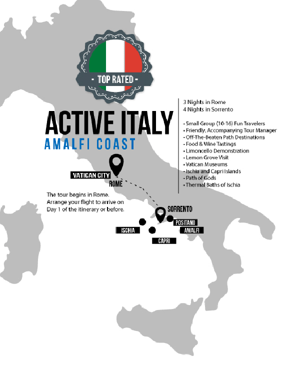 Description: Start off in Rome for this week-long journey where you'll be guided through Ancient and Modern Rome. Then you'll head to Sorrento for an ultimate Italian coastal and island experience. On the way to Sorrento you will visit a Lemon grove famous for the Sorrento Limoncello where you will get to see how limoncello is made and of course have a taste. The tasting will be followed by a hands-on cooking lesson on a typical dish of the area. The next day you'll be taken by boat to the beautiful island of Capri to stroll the town and on the way see up close the famous Faraglioni - three towering rock formations off the coast the island, and the Blue Grotto. The next day you will enjoy a boat ride along the Amalfi Coast with stops in Positano and Amalfi. Locations: Rome, Vatican City, Sorrento, Capri, Ischia, Positano, Amalfi View Day to Day | View Photos | What's Included |